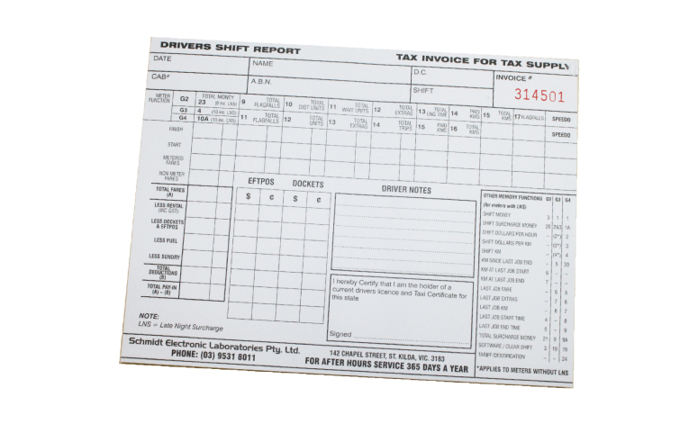 Shift report books allow owners to keep track of each driver’s shifts. The items on the sheets are labeled with the same numbering system as used in the G4 Taximeter’s memory to simplify the process. Each book contains 100 pages.
